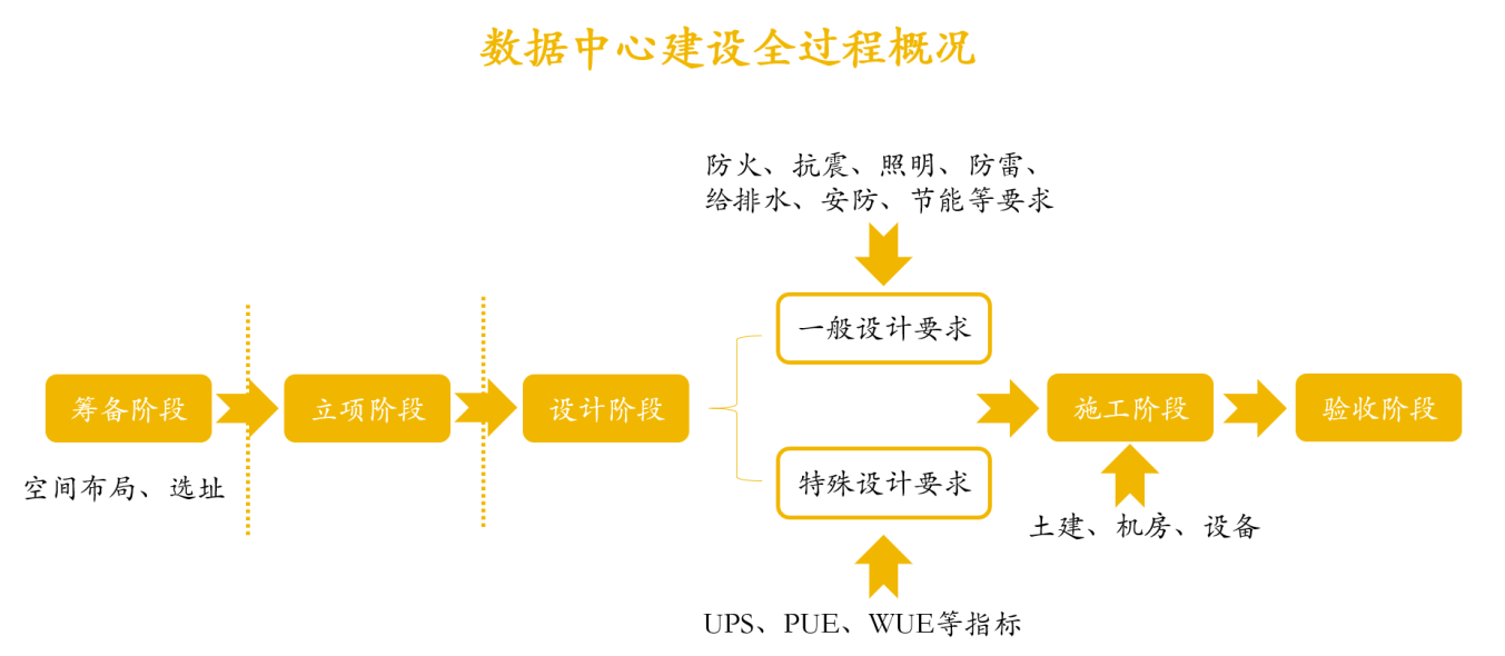 數據中心在本質上屬于建築物的一種形态,因此從(cóng)建設流程上而言,與普通的地産項目比較接近(見(jiàn)下圖所示),按照(zhào)階段都(dōu)可(kě)以劃分(fēn)爲:籌備—立項—設計(jì)—施工(gōng)—驗收。
